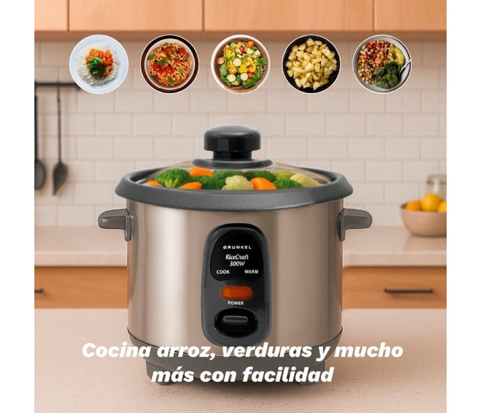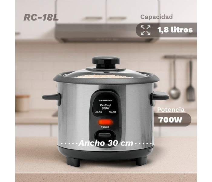 La arrocera de GRUNKEL RC-18L posee gran capacidad, ideal para familias o preparaciones abundantes. Con 1,8 litros de capacidad y 700W de potencia, cocina arroz y otros cereales de forma rápida, sin complicaciones ni necesidad de supervisión constante. Una vez finalizada la cocción, activa automáticamente la función mantener calor, manteniendo la comida caliente y lista para servir en cualquier momento. Su cubeta interior antiadherente es extraíble y fácil de limpiar, lo que mejora la experiencia de uso. La carcasa exterior de acero inoxidable le da un acabado resistente, elegante y duradero. Además, cuenta con indicadores luminosos para saber en qué estado está (cocinar o mantener caliente) y una tapa de cristal transparente que permite vigilar el proceso sin levantarla. La arrocera RC-18L es práctica, eficiente y perfecta para cocinar arroz con el punto justo sin esfuerzo.Especificaciones