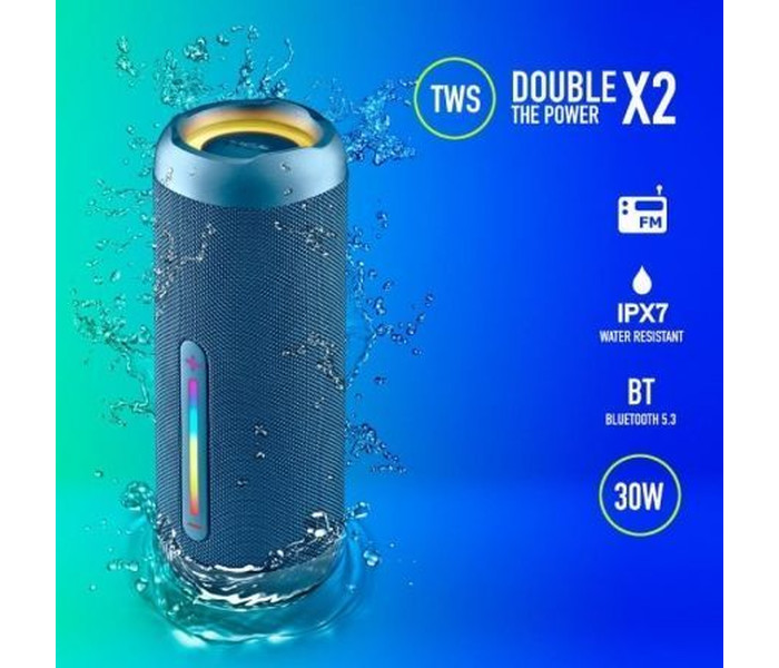 Altavoz inalámbrico compatible con tecnología Bluetooth 5.3 para disfrutar de la música tanto en el interior como en el exterior.. Tamaño compacto y portátil, proporciona sonido de alta calidad gracias a su gran potencia de salida, 30W.. Diseño robusto con material de tela resistente. Resistente al agua, conforme a la norma IPX7. Sumergible durante 30 minutos a menos de 1 metro de profundidad.. Amplifica el sonido, puede emparejar dos dispositivos de forma simultánea y aumentar la potencia de sonido gracias a su Tecnología True Wireless.. Compatible con la Tecnología Bluetooth: Conecta tu dispositivo vía Bluetooth y reproduce tu música con la mejor calidad de sonido.. Dispone de puerto de entrada USB & TF para conectarle una memoria de hasta 32GB.. Incluye entrada AUX In para Jack 3,5mm. Batería recargable de Litio de 7,4V/2500mAh que puede reproducir música hasta 9 horas (50 % de volumen).. Controla tu música desde el altavoz con los sencillos botones integrados.. Equipado con un cable de carga USB tipo C para cargarlo cómodamente.. El alcance del móvil para la reproducción de música es de hasta 10m.. . Especificaciones:. . Compatible con bluetooth 5.3 . TWS (consigue doble potencia conectando 2 altavoces al mismo tiempo sin cables) . Potencia pico de salida: 30W. Potencia RMS: 15W. Entrada de audio AUX . Entrada de audio USB: hasta 32GB. Entrada de audio TF: hasta 32GB. Control de volumen . Batería: Ion-Li 7,4V/2500mAh. Tiempo de funcionamiento: 9 horas. Resistente al agua: IPX7. Frecuencia de operación: 2402-2480MHz. Potencia máxima de salida de RF: 6dBm. Formatos de audio: MP3/WAV/WMA