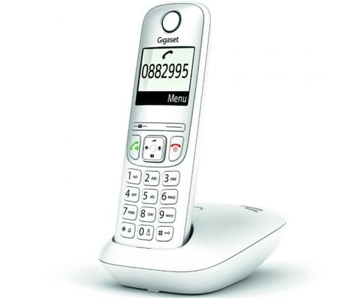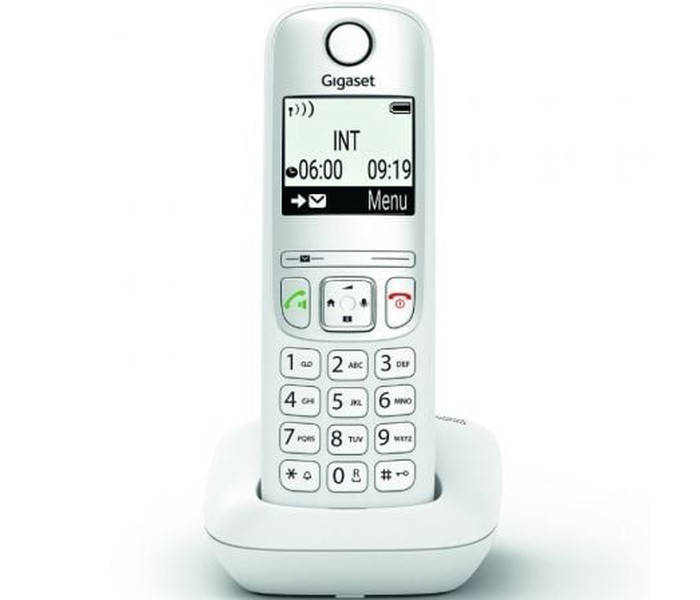 | Características | General - Terminal, alt x anch x prof en mm: 155 x 49 x 28- Conexión: Analógico - Standares DECT: DECT, GAP - ECO DECT: Reducción automática de transmisión de energía, Libre de radiación en modo standby, Bajo consumo de energía - Funciones: Fuents Jumbo Características adicionales - Tiempo en modo en espera hasta (h): 180 - Tiempo de conversación hasta (h): 14 - Número de registros en agenda telefónica (nombre/número): 100 - Función de alarma: Si - Call block function: Si - Blacklist (number of entries): 32 - Anonymous call suppression: Calls without CLIP number are only indicated visually: Si - Day / night mode: Timed ringtone deactivation on handset: Si - Señalización óptica de llamada (pantalla iluminada): Pantalla iluminada, La tecla de llamada parpadea - Número de terminales ampliables: 4 - Llamadas internas gratuitas: Si - Transferencia de teléfonos/libreta de direcciones interna a través de DECT (de terminal a terminal): Si - Transferencia interna de llamadas externas, llamada de conferencia, devolución de llamada: Si Sonido - Conversación manos libres: Sí - Conversación manos libres terminal / baset: Terminal - Volumen ajustable: Mediante el Menú - Número de tonos: 20 Teclado - Teclado iluminado: Si - Manejo sencillo con teclas de navegación: Si - Tecla de mensajes: Si Dimensiones y Peso - Terminal, peso incl. batería en g: 119 - Estación base, alt x anch x prof en mm: 44 x 88 x 105 - Estación base, peso en g: 70 - Cargador, alt x anch x prof en mm: 38 x 70 x 77 - Cargador, peso en g: 36 - Batería: 2 x NiMH AAA |