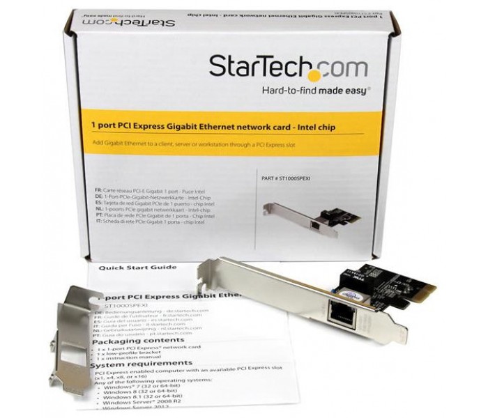 Amplíe el rendimiento y la capacidad de su servidor u ordenador de sobremesa agregándole un puerto Ethernet Gigabit a través de una ranura PCI Express. Esta tarjeta de red GbE (Ethernet Gigabit) facilita la creación de soluciones de conexión en red de alto rendimiento y que resultan económicas. h3. El rendimiento y la fiabilidad que requiere de su conectividad en red Esta tarjeta de red PCI Express Ethernet Gigabit utiliza el chipset Intel® I210-AT, que ofrece la potencia, el rendimiento y la mejor capacidad que se requieren para conexiones en red fiables con su servidor u ordenador. Compatible con las normas IEEE 802.3/u/ab, esta tarjeta de red GbE ofrece una eficaz actualización o reemplazo de un puerto de red, con una capacidad máxima de transmisión de hasta 1000Mbps en cada dirección (2000Mbps en total): hasta diez veces más rápido que Ethernet 10/100. El chipset I210 ofrece muchas funciones avanzadas para compatibilidad con el equilibrio de la carga del flujo de tráfico de la red, a fin de mejorar la transmisión y ofrecer una mayor fiabilidad de los datos. También es compatible con la función Audio-Video Bridging (puente de audio y vídeo), que permite la sincronización de transmisiones de contenido multimedia, almacenamiento en búfer y reserva de recursos, de forma muy controlada. h3. Solución versátil y económica Compatible con una amplia gama de sistemas operativos, esta versátil NIC PCIe Gigabit es ideal para diversas aplicaciones empresariales en que se requieren actualizaciones de servidores o estaciones de trabajo. Es una forma económica de actualizar su servidor u ordenador desde un puerto Ethernet 10/100 a un puerto Ethernet Gigabit, o de agregar un puerto Ethernet para aprovechar funciones avanzadas como etiquetado VLAN, tramas jumbo, WOL ("Wake-on-LAN", reinicio mediante red) y Auto MDIX (detección automática de MDIX). h3. Fácil instalación Con un diseño de doble perfil, la tarjeta de red PCI Express se instala fácilmente en una amplia gama de modelos de cajas de ordenador/servidor, indistintamente de su factor de forma. La tarjeta viene equipada con un soporte de tamaño grande, e incluye un soporte para instalación en perfil bajo/de altura media, a elegir según sea necesario. El modelo ST1000SPEXI está avalado por la garantía de 2 años de StarTech.com y con soporte técnico gratuito de por vida.