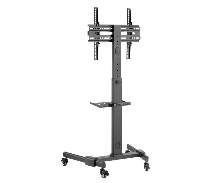 Con este soporte se puede colocar la TV en el mejor ángulo de visión y transpórtala donde quieras. El soporte es ajustable en altura e inclinación. Incluye una bandeja para equipo multimedia. La ruedas tienen freno que permiten bloquear el desplazamiento. Fácil montaje y operación. Incluye instrucciones y accesorios de montaje.