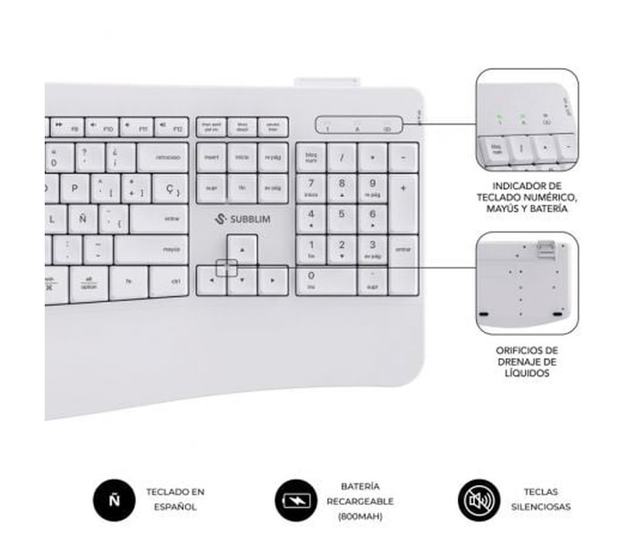 Teclado Inalámbrico por Bluetooth Subblim 2PUE200 Pure Extended/ PlataEspecificaciones:. . Teclado completo ultra delgado con conectividad Bluetooth de última generación 5.1. Diseño ideal para espacios reducidos sin perder productividad gracias al teclado numérico incorporado. Compatible Android, IO..