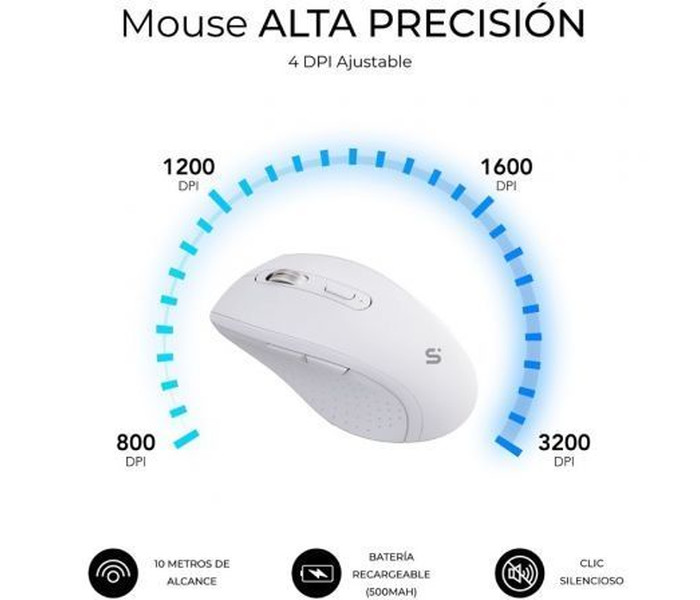 Ratón Ergo Inalámbrico. El pack se completa con un ratón ergonómico, pensado para adaptarse a la perfección a la mano derecha. Dispone de botones laterales de “Avanzar” y “Retroceder” y un tacto suave con clic silencioso. Además, puedes ajustar su DPI entre 800/1200/1600/3200 para obtener la sensibilidad y precisión que mejor se ajuste a tu estilo de trabajo o juego.