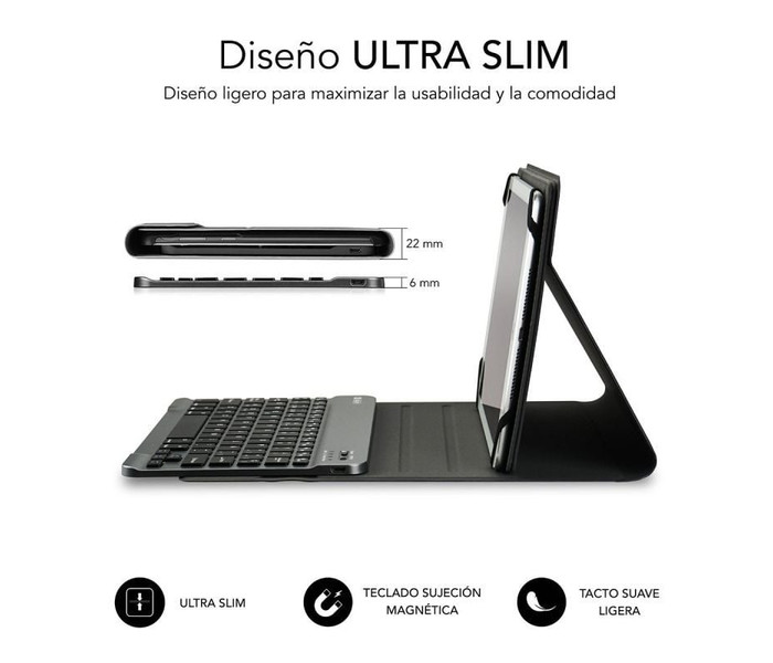 - Exclusivo sistema de sujeción de la Tablet mediante molde de silicona. No daña la pantalla de tu dispositivo y se adapta al teclado extraíble Bluetooth