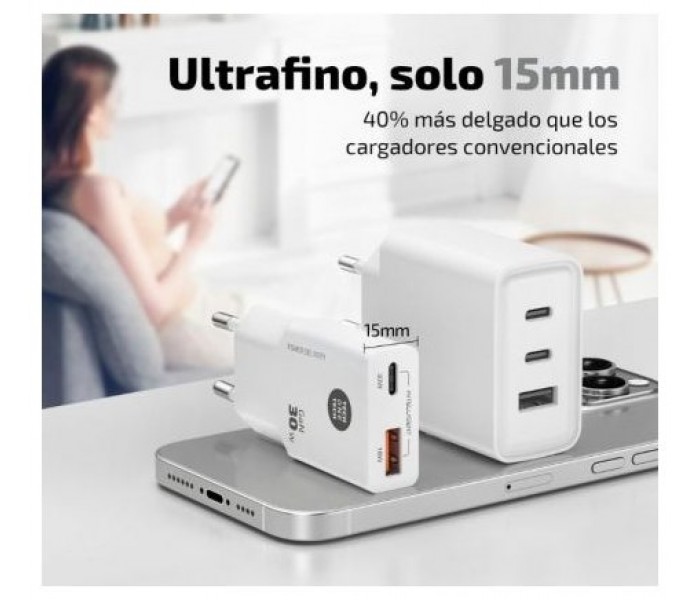 Cargador ultrarrápido GaN Power Delivery 3.0 (PD) 30W, color blanco. Carga hasta un 400% más rápido que un cargador estándar de 5W. Compatible con dispositivos anteriores. 2 Conectores: tipo USB-C de 3A + Conector USB-A. Este cargador permite cargar dispositivos como tabletas, móviles, consolas, baterías, auriculares, etc.