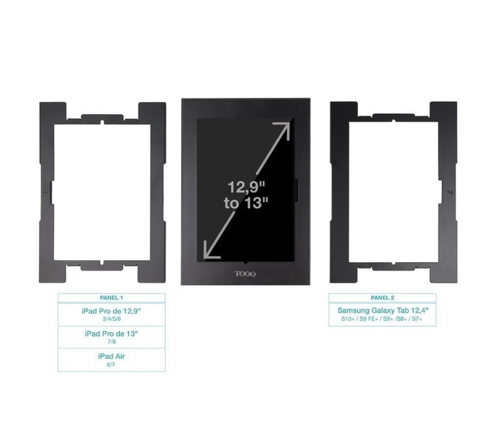 Marco antirrobo con cerradura a llave para tablets de 12,4” a 13”Tablets compatibles:- 12,4”: Samsung Galaxy TAB S10+, Samsung Galaxy TAB S9 FE+, Samsung Galaxy TAB S9+, Samsung Galaxy TAB S8+, Samsung Galaxy TAB S7+- 12,9”: iPad Pro3, iPad Pro4, iPad Pro5, iPad Pro6- 13”: iPad Pro7, iPad Pro8, iPad Air6, iPad Air7Compatible con VESA 75x75Ranuras para un fácil acceso a todos los botones, cámara y cable de alimentación de la Tablet.Incluye dos paneles frontales para escoger el que mejor se adapte al dispositivo.Permite instalación directa en pared o montaje sobre soporte con VESA 75x75, como los modelos TQATC2601-B y TQATWM3401-B, entre otros.Almohadillas de protección para evitar arañazos y mejorar la sujeción.Peso máximo soportado: 1 KgColor: NegroMaterial: fabricado en acero de alta calidadMedidas del producto: 257x350x22mmPeso Neto: 2,060 Kg Peso bruto: 2,180 KgMedidas embalaje: 262x358x38 mm