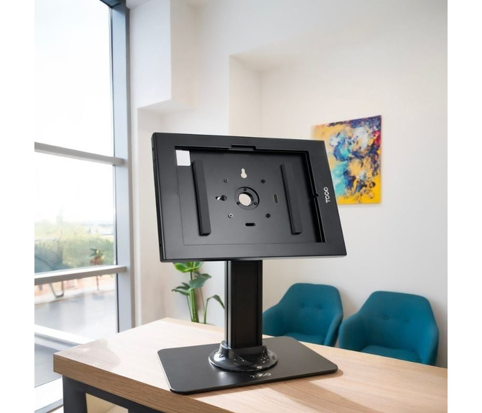 Soporte de Mesa para Marco Antirrobo de Tablet TooQ TQATC2601-B/ NegroCompatible con VESA: 75x75Peso máximo soportado: 3 KgÁngulo de inclinación: 0°/+75°Ángulo de rotación: 0°/+90°Altura del soporte: 296 mmMedidas de la peana: 300x200 mmSistema de ocultación de cablesAlmohadillas de silicona en la b..