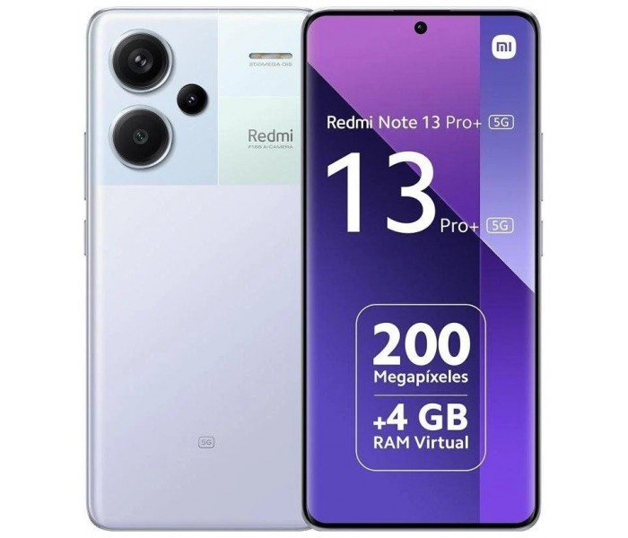 Xiaomi Redmi Note 13 Pro+. Diagonal de la pantalla: 16,9 cm (6.67"), Resolución de la pantalla: 2712 x 1220 Pixeles. Familia de procesador: MediaTek Dimensity. Capacidad de RAM: 12 GB, Tipo de RAM: LPDDR5, Capacidad de almacenamiento interno: 256 GB. Resolución de la cámara trasera (numérica): 200 MP, Tipo de cámara trasera: Triple cámara. Capacidad de la tarjeta SIM: SIM doble. Capacidad de batería: 5000 mAh. Color del producto: Púrpura. Peso: 204,5 g