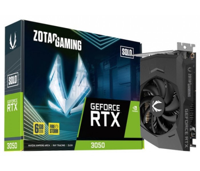 La ZOTAC GeForce RTX 3050 SOLO es una tarjeta gráfica impulsada por la GPU GeForce RTX 3050 de NVIDIA. La potente serie de tarjetas gráficas GeForce RTX 30 se basa en la arquitectura NVIDIA Ampere y ofrece nuevos niveles de realismo en los juegos, velocidad y eficiencia de rendimiento y experiencias de realidad virtual realistas. Otras características incluyen Real-Time Ray Tracing, NVIDIA Ansel, con amplias herramientas para tomar capturas de pantalla en juegos, así como NVIDIA G-SYNC, G-SYNC HDR, DirectX 12 Ultimate, NVIDIA DLSS, PCI Express Gen 4, NVIDIA Free Style, NVIDIA Shadow Play, NVIDIA High lights, Vulkan RT API y OpenGL 4.6. La GPU instalada en la ZOTAC GeForce RTX 3050 SOLO tiene 2304 unidades de sombreado. La memoria GDDR6 de 6 GB está conectada con 96 bits.